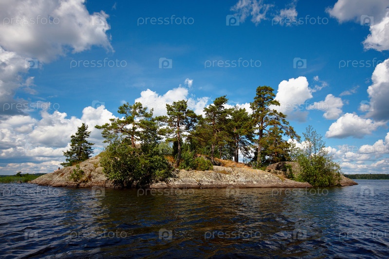 Остров на озере и ярко-голубое облачное небо