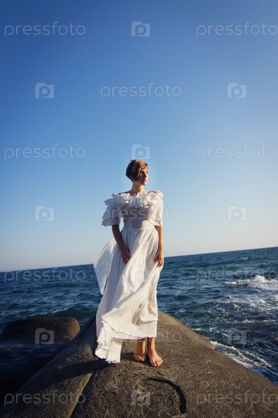 Молодая девушка отдыхает на скалистом берегу моря в ветреный день