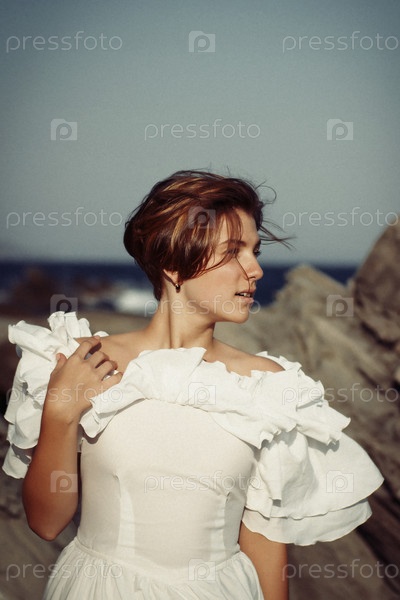 Девушка отдыхает на скалистом берегу моря в ветреный день
