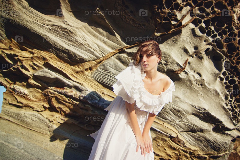 Молодая девушка отдыхает на скалистом берегу моря в ветреный день