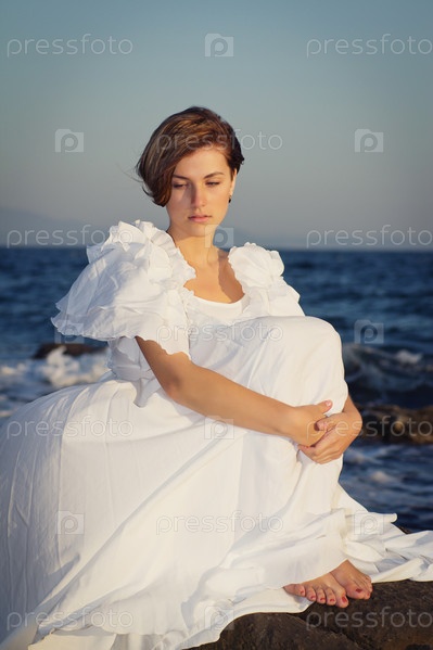 Молодая девушка отдыхает на скалистом берегу моря в ветреный день