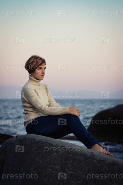 Молодая девушка отдыхает на скалистом берегу моря в ветреный день