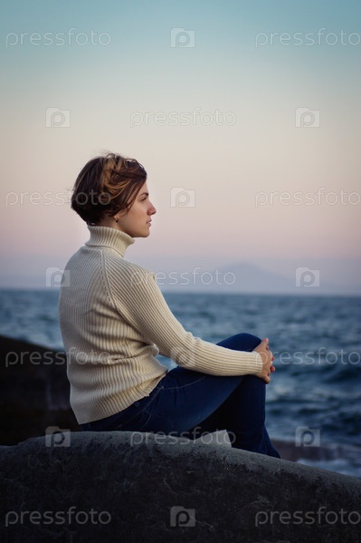 Молодая девушка отдыхает на скалистом берегу моря в ветреный день