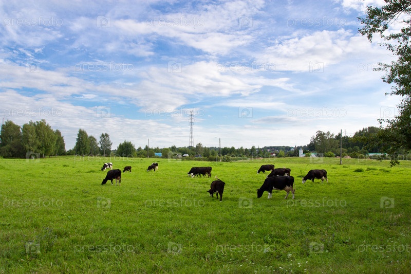 Коровы пасутся на лугу в солнечный день