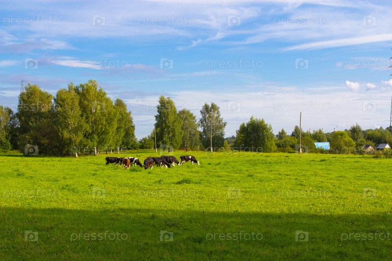 Коровы пасутся на лугу в солнечный день