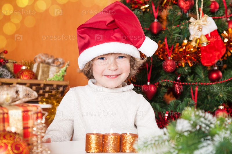Счастливый мальчик в колпаке Санты с подарками на фоне рождественской елки