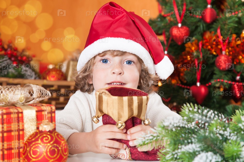 Мальчик с носком для подарков на фоне рождественской елки
