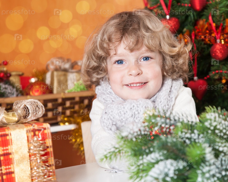 Счастливый ребенок на фоне украшенной новогодней елки