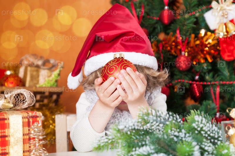 Счастливый ребенок в новогоднем колпаке прячется за шаром на фоне украшенной новогодней елки