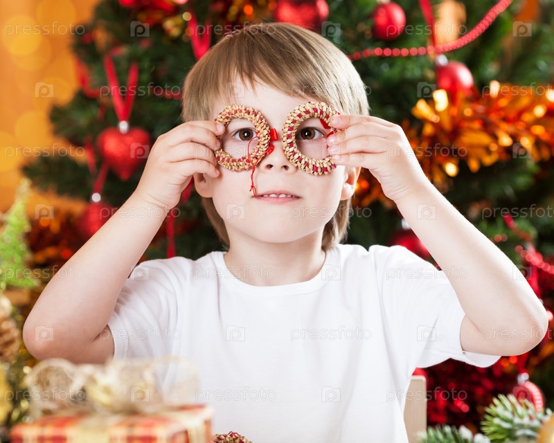 Улыбающийся мальчик веселится на фоне рождественской елки