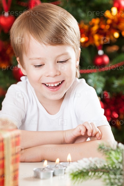 Портрет счастливого мальчика на фоне рождественских огней