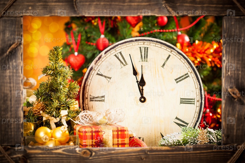 Старинные деревянные часы в деревянной раме на фоне рождественской елки