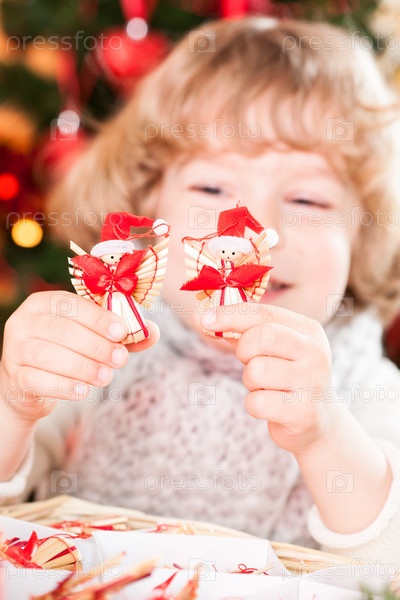 Счастливый мальчик с украшениями ручной работы на фоне новогодней елки