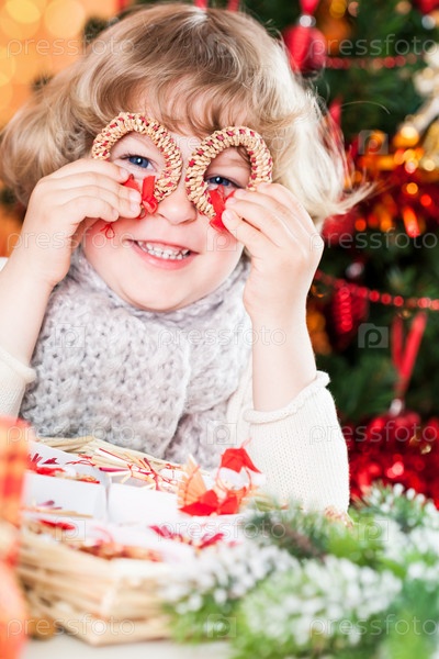 Счастливый мальчик с украшениями ручной работы на фоне новогодней елки
