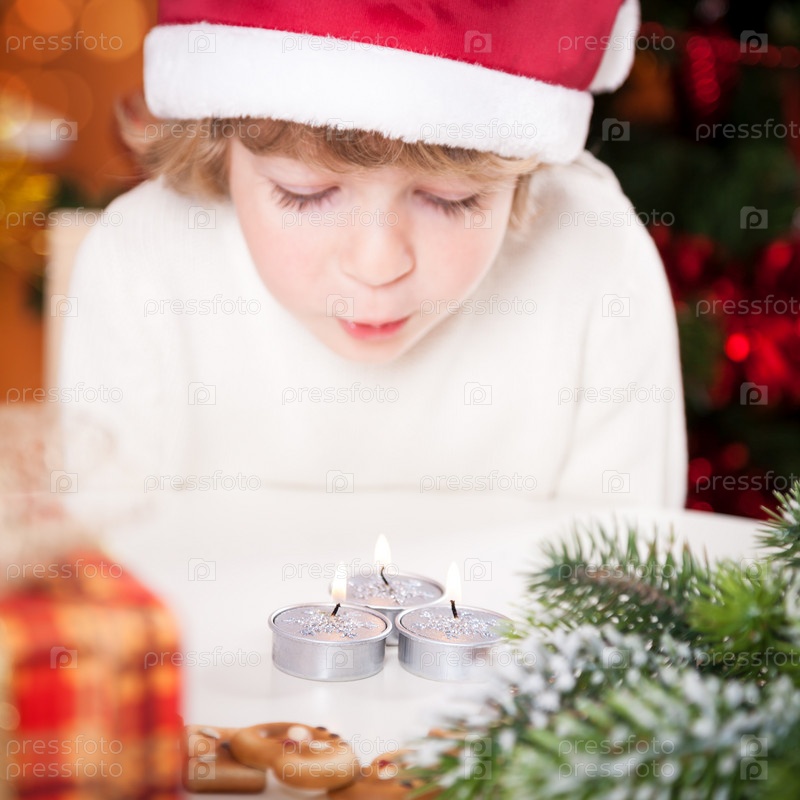 Красивый ребенок дует на рождественские свечи