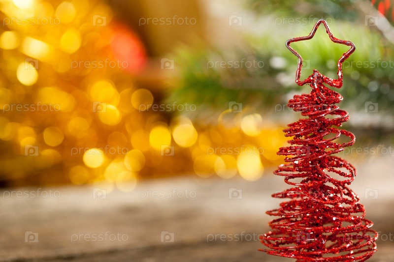 Маленькая рождественская елка ручной работы на фоне размытых огней