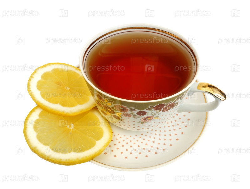 Чашка чая с ломтиками лимона, изолированная на белом фоне