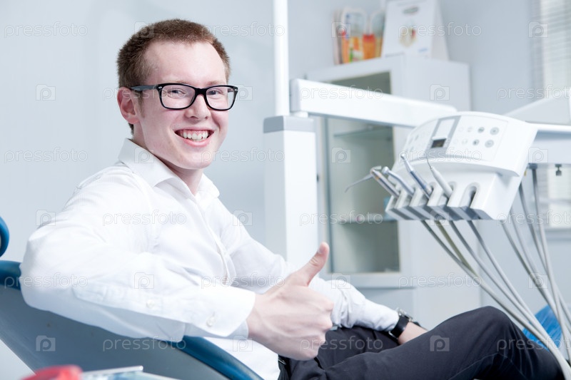 Счастливый пациент в кабинете стоматолога