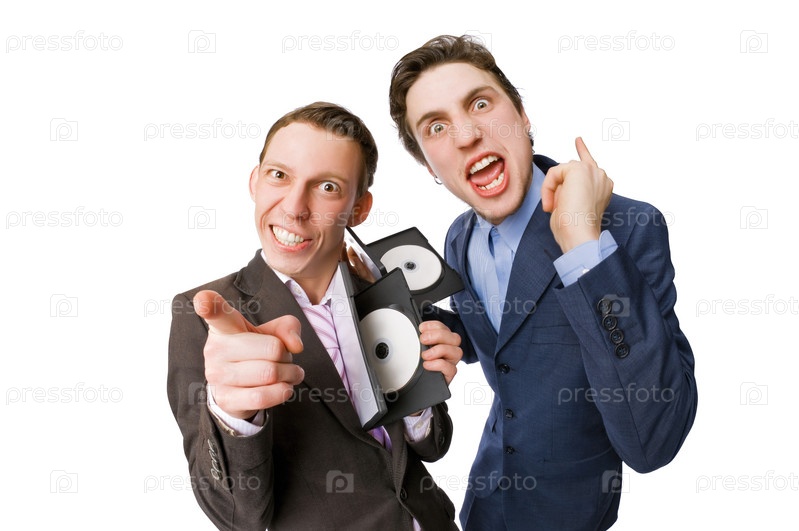 Два молодых человека, предлагающих DVD-диски на белом фоне
