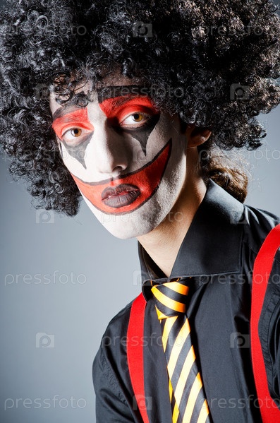 Бизнесмен с раскрашенным клоунским лицом и в парике