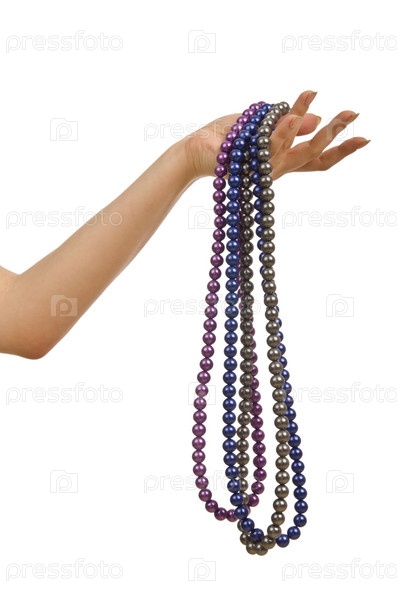 Жемчужное ожерелье в руке на белом фоне