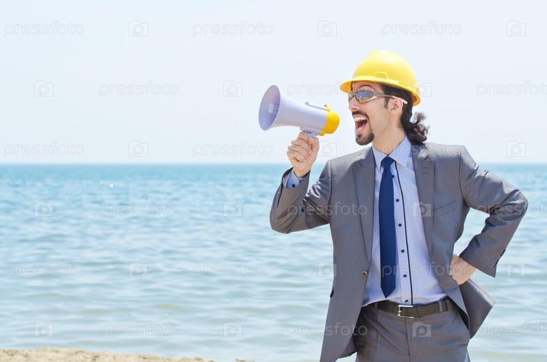 Человек в каске с громкоговорителем на пляже