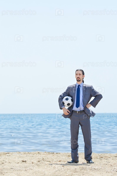 Бизнесмен с футбольным мячом на пляже