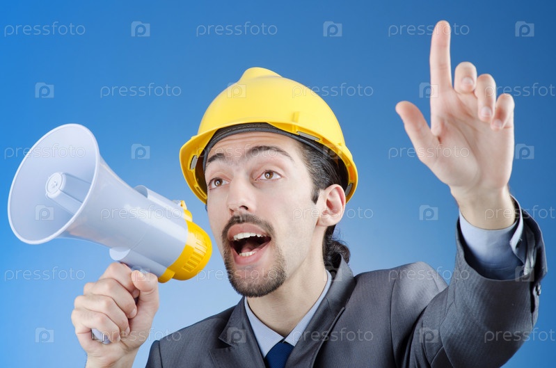 Строитель кричит в громкоговоритель