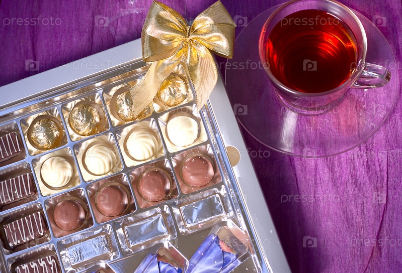 Праздничная коробка конфет и чашка чая на фиолетовом фоне