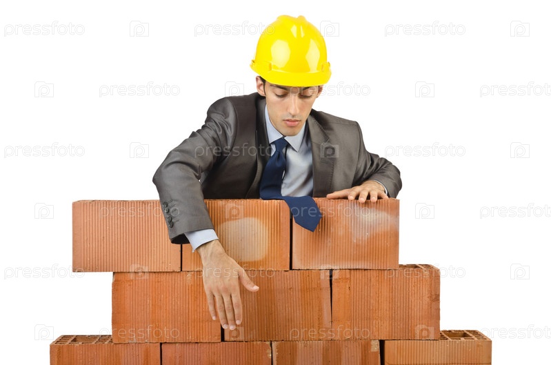 Бизнесмен с кирпичами на белом фоне