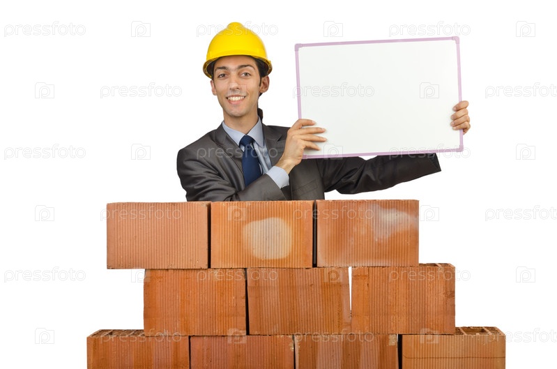 Бизнесмен с кирпичами на белом фоне