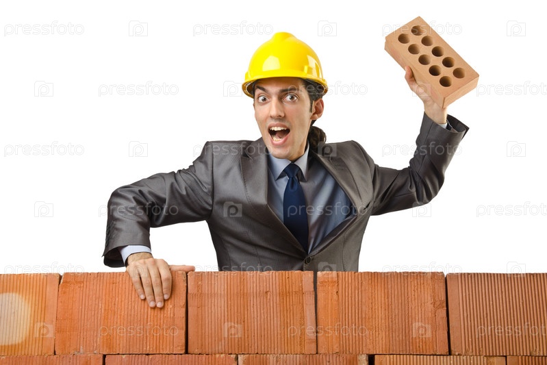Бизнесмен с кирпичами на белом фоне