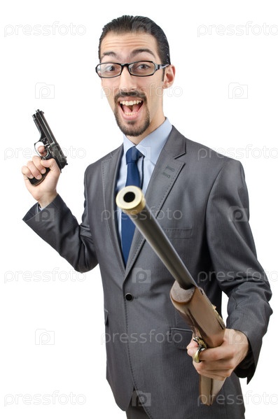 Бизнесмен с ружьем, изолированный на белом фоне
