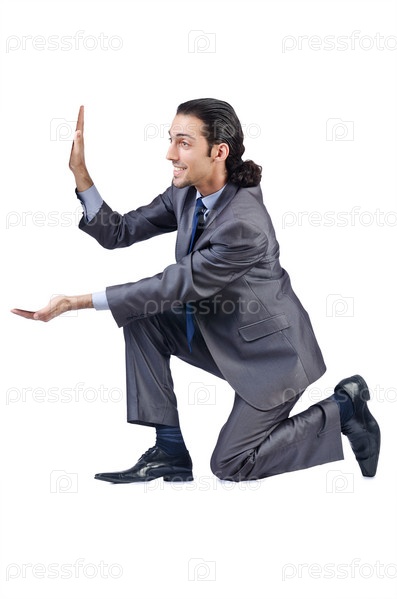 Молодой предприниматель толкает невидимое препятствие