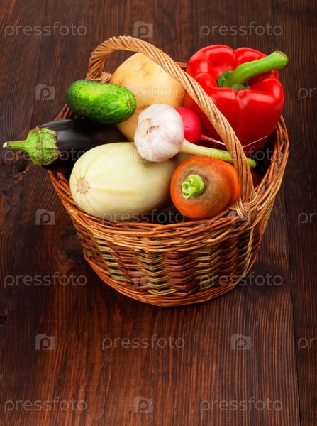 Свежие спелые овощи в корзине на деревянном столе