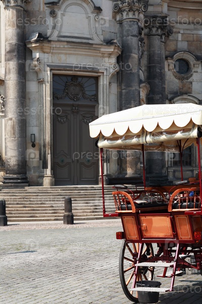 Старинная деревянная повозка возле серого старого здания
