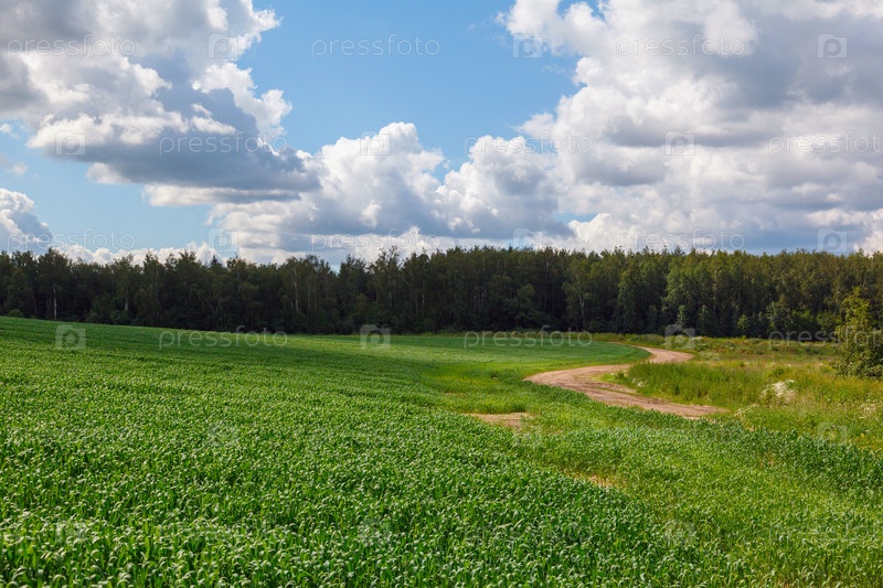 Хвойный лес, сельскаях дорога, сельскохозяйственное поле в летний день с маленькими облаками в небе