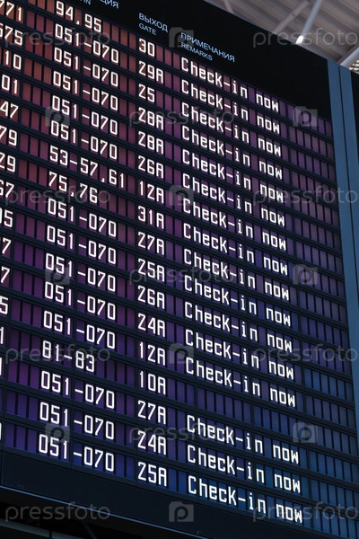 Информационное табло со списком рейсов и информацией о регистрации в аэропорте