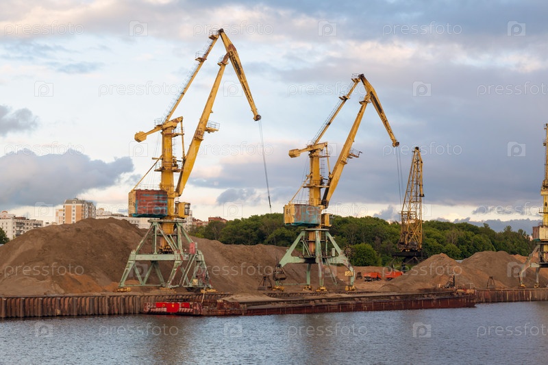 Московский речной порт в летний день, краны разгружают песок с баржи