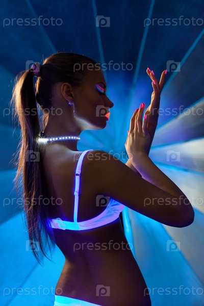 Девушка с ультрафиолетовым макияжем танцует в темноте