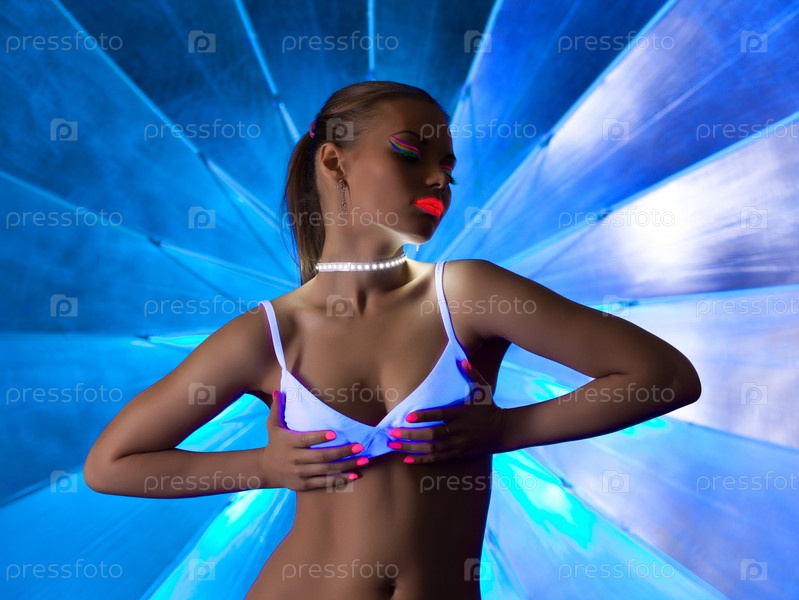 Девушка с ультрафиолетовым макияжем танцует в темноте