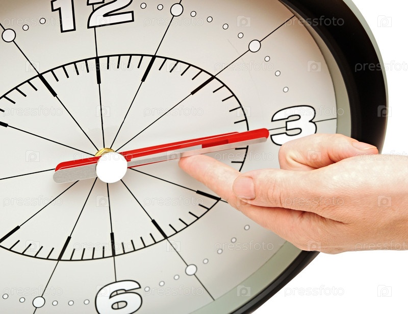 Женская рука перемещает стрелки часов