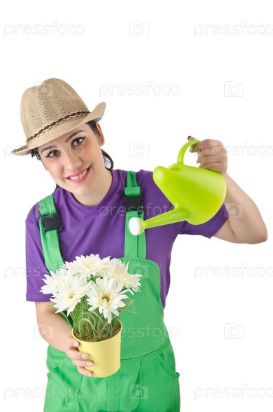 Девушка поливает растения на белом фоне