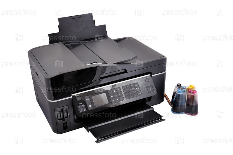 Многофункциональное устройство и СНПЧ на белом фоне