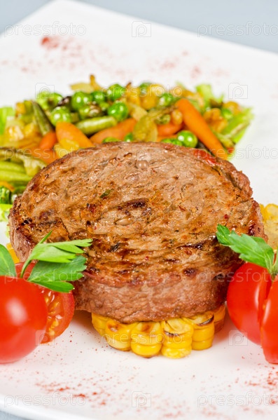Бифштекс с овощами и соусом