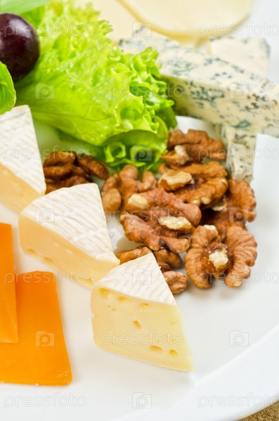 Сыр с листьями салата, виноградом и орехами крупным планом