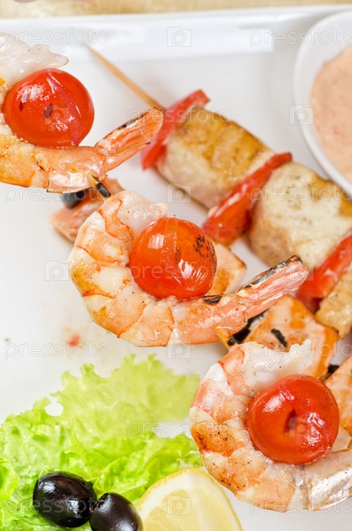 Лосось на гриле, креветки с помидорами и перцем на бамбуковых палочках