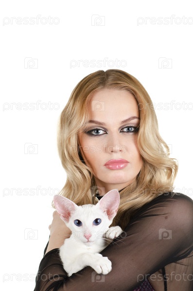 Молодая блондинка с восточной короткошерстной кошкой на белом фоне