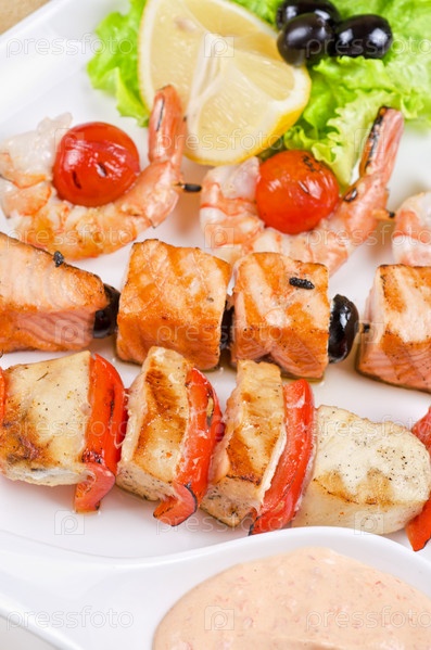 Жареные лосось и креветки с помидорами и перцем на бамбуковых палочках