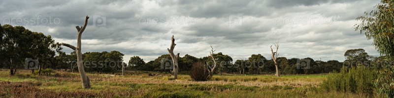 Панорама с эвкалиптами, высохшими от соленой воды, в окружении зеленого леса и трав с темными облаками на небе в штате Виктория, Австралия